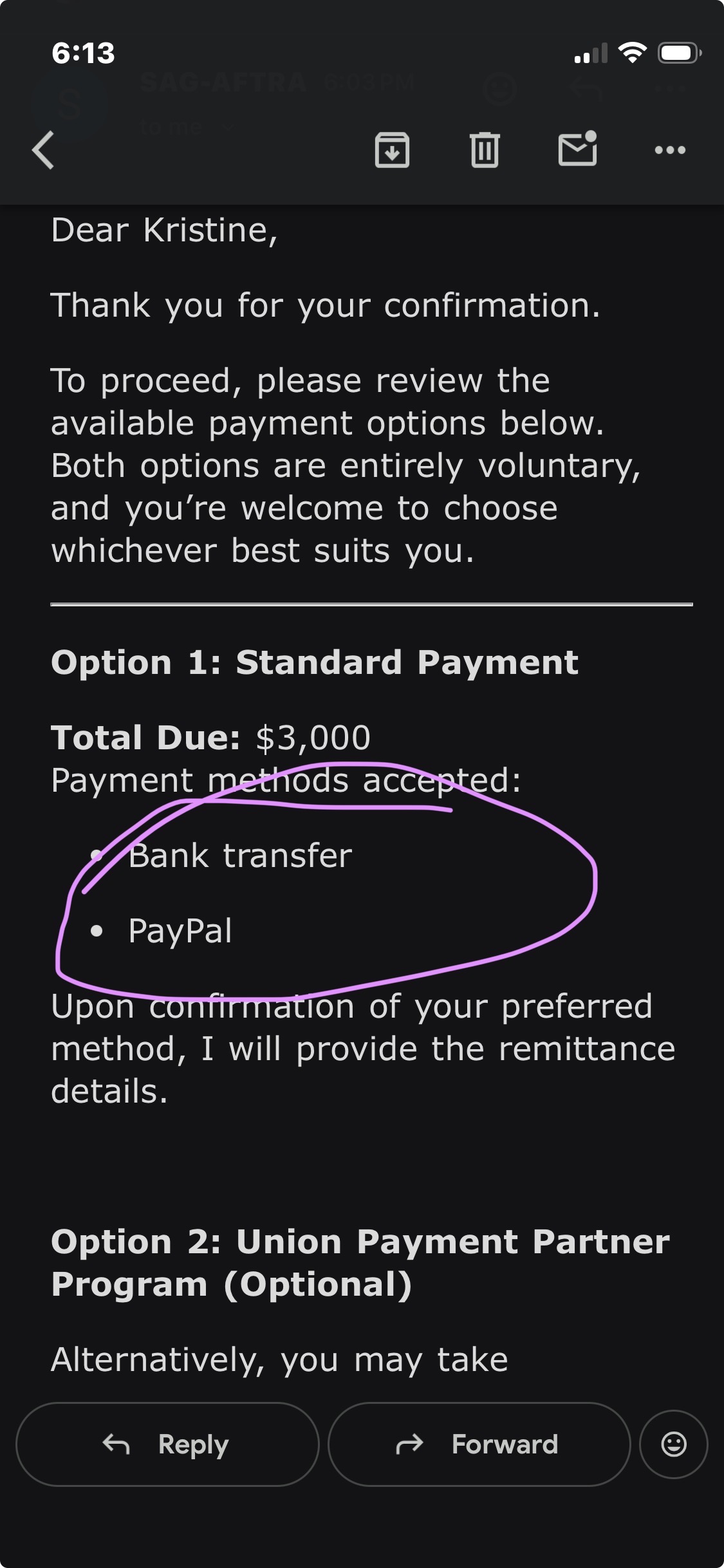 Continuing on with the scam, all was good until the project said that I must be SAG-AFTRA and they had a rep that could help me with that. I was like ok, I get this, not a problem, until their so called rep e-mailed me and it looked legit, except for one thing, the email was sent from a .net and not .org. I had been researching SAG-AFTRA and all of their emails ended in .org so I decided to email them about a possible scam and someone got back to me right away, indeed it was. Next email I got from the fake company said I can pay my dues by PayPal, bank account or bit coin….bit coin…..absolutely not and that was a major red flag in red flag city as I know as well as anything else, dues should only be paid through SAG-AFTRA on their website or via phone. I’m no genius, but I know when it’s game over.
