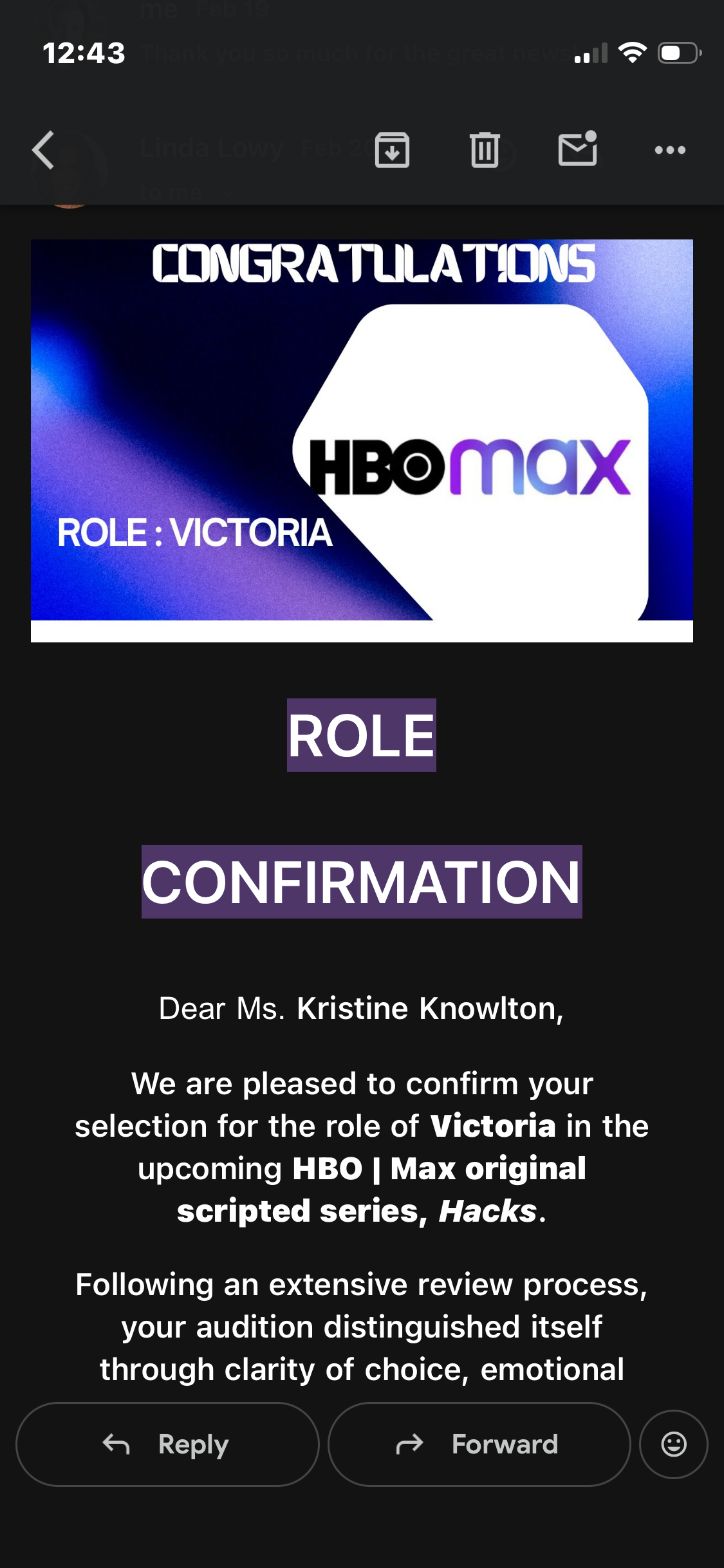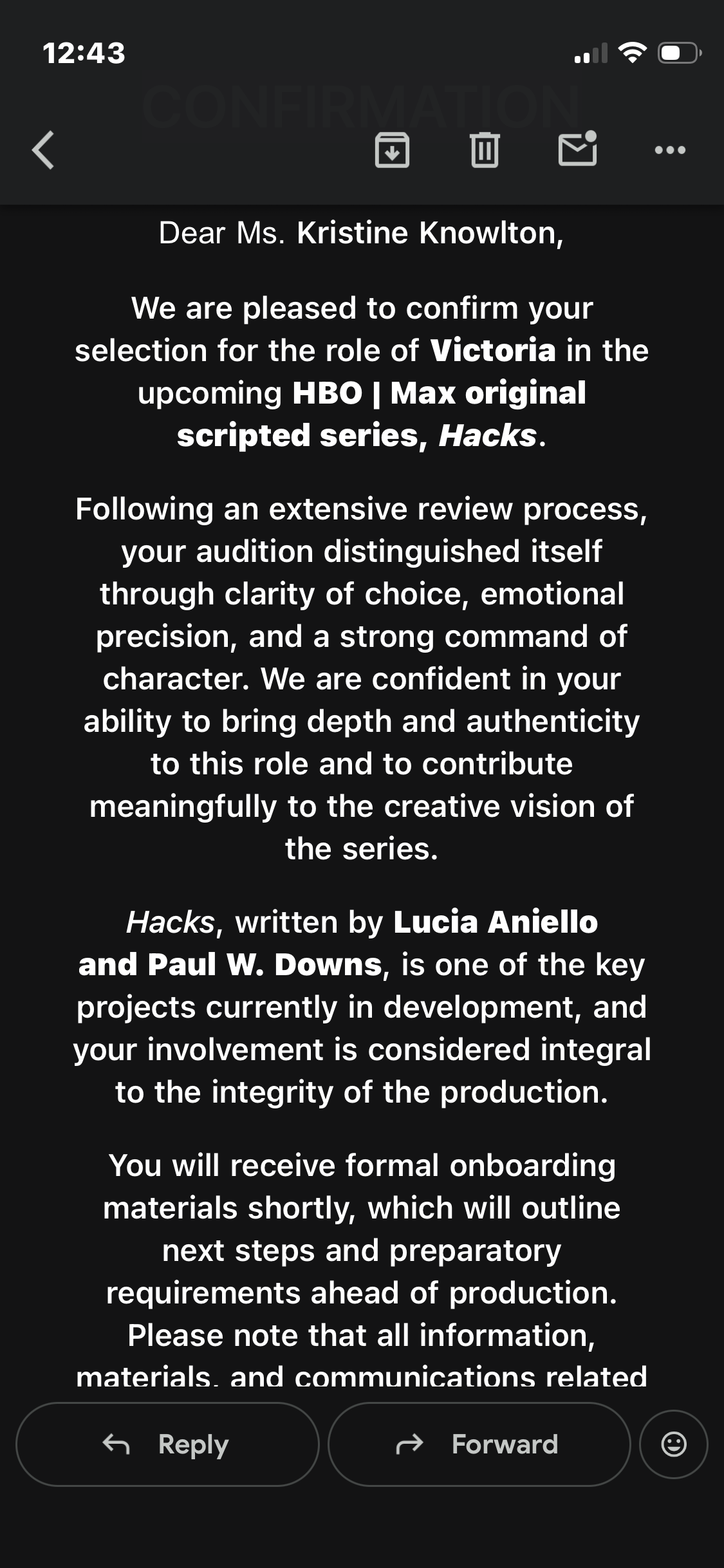 I am posting some screenshots of when it all went south and the scam took place as well as the role I was offered. Again, I am heartbroken and would have loved to work on “Hacks” with Jean Smart as she has been an inspiration to me for a long time and is so funny. I really wish this wasn’t a scam. Again, left heartbroken and now less trusting.